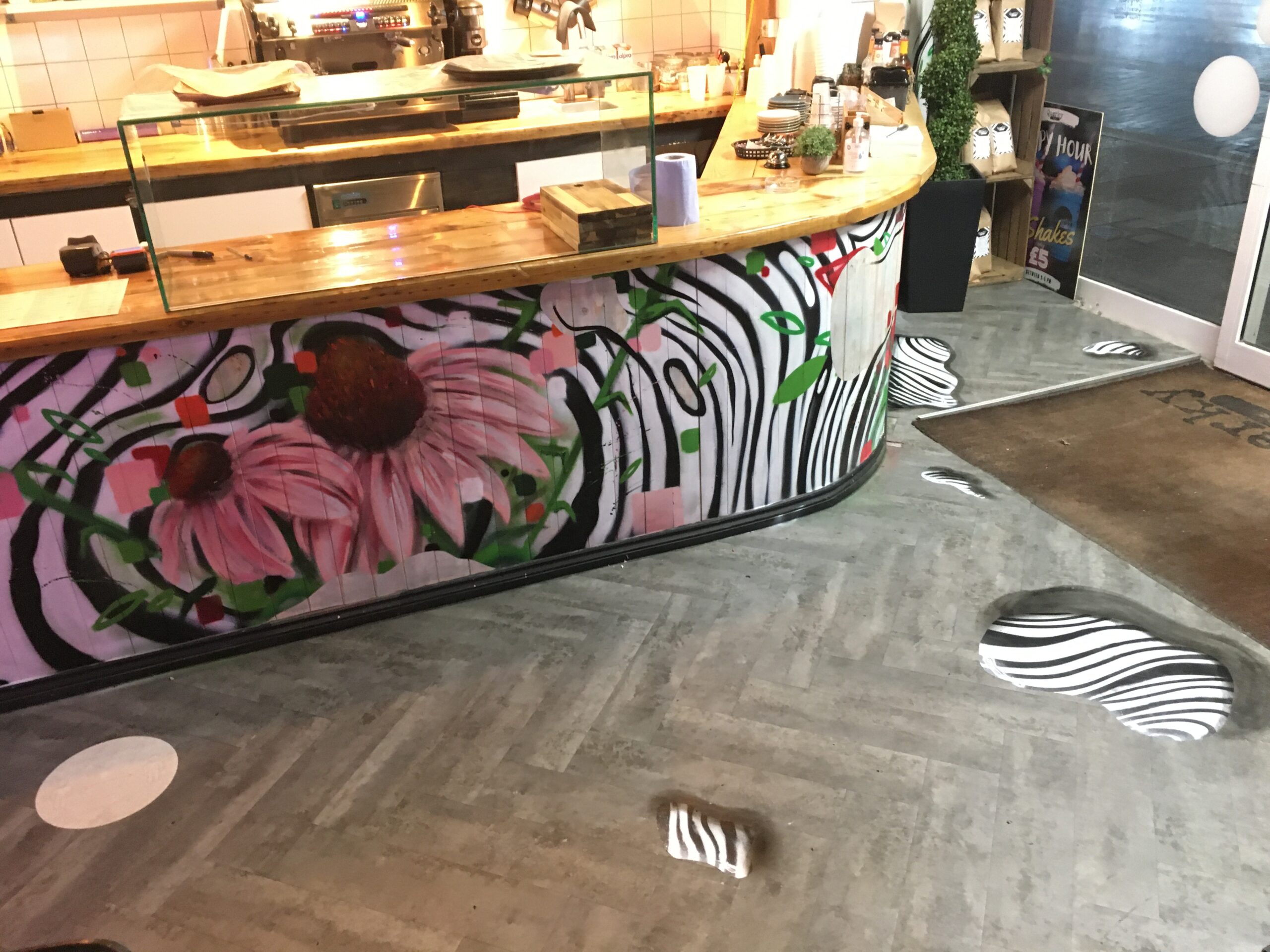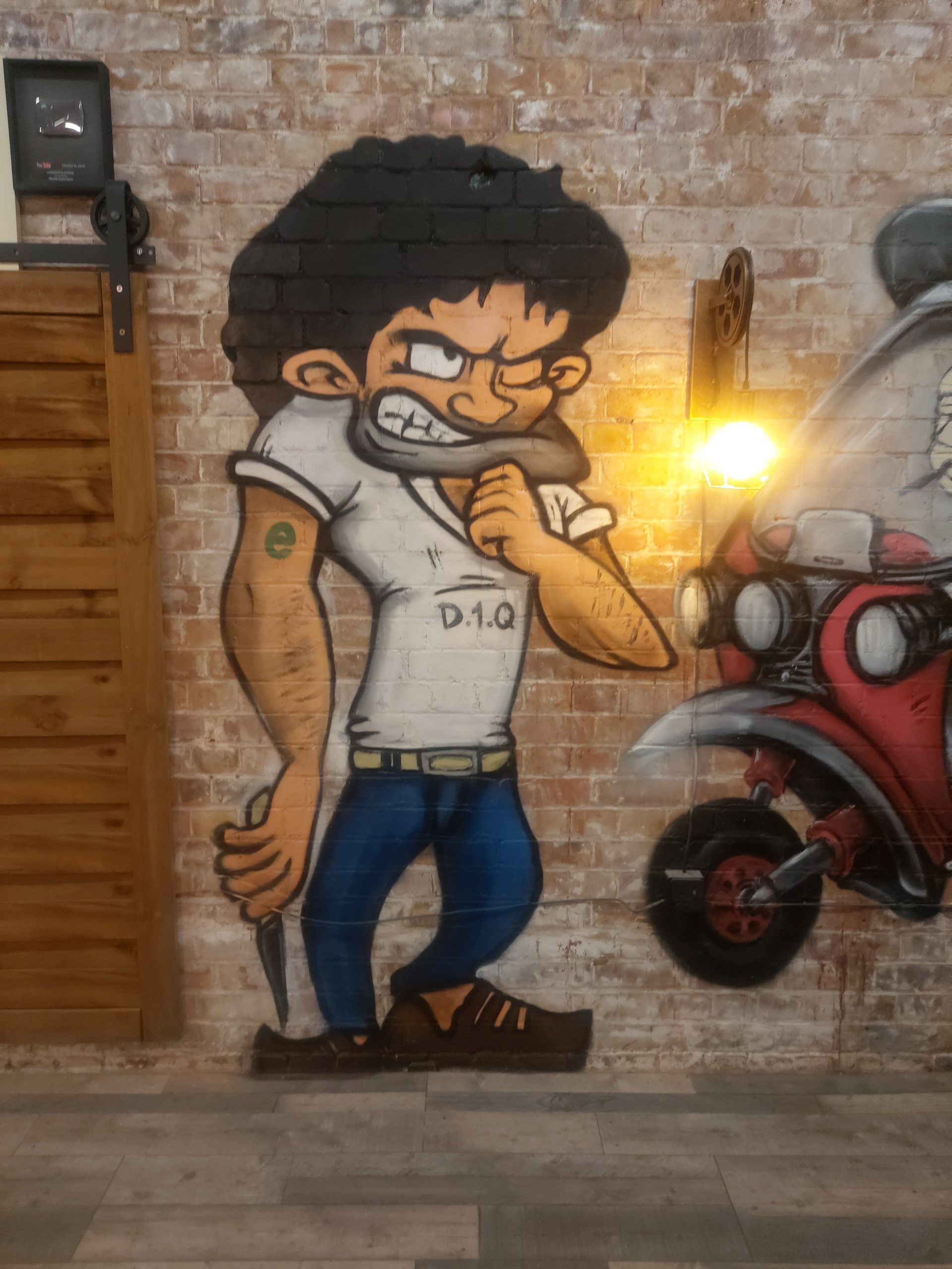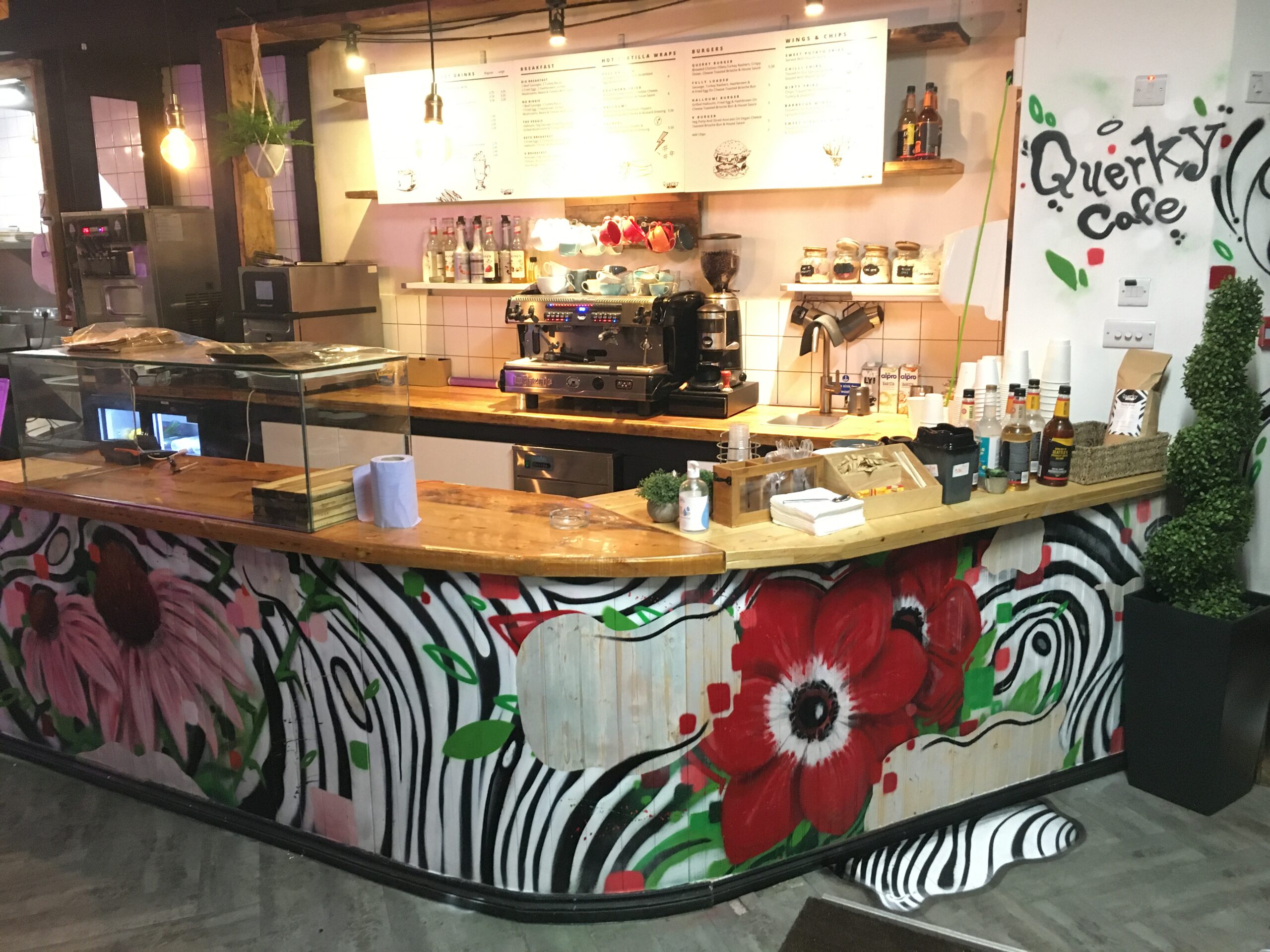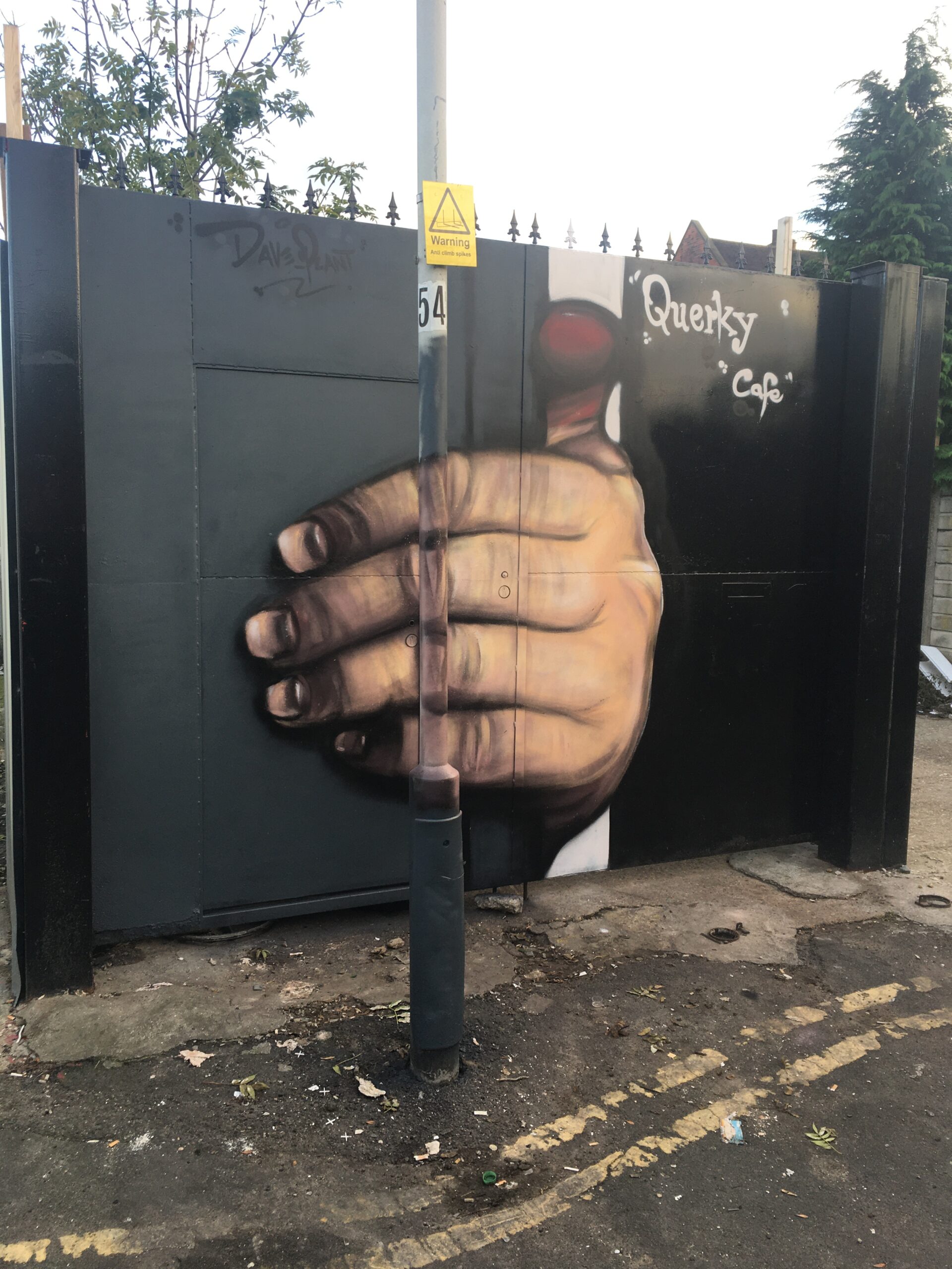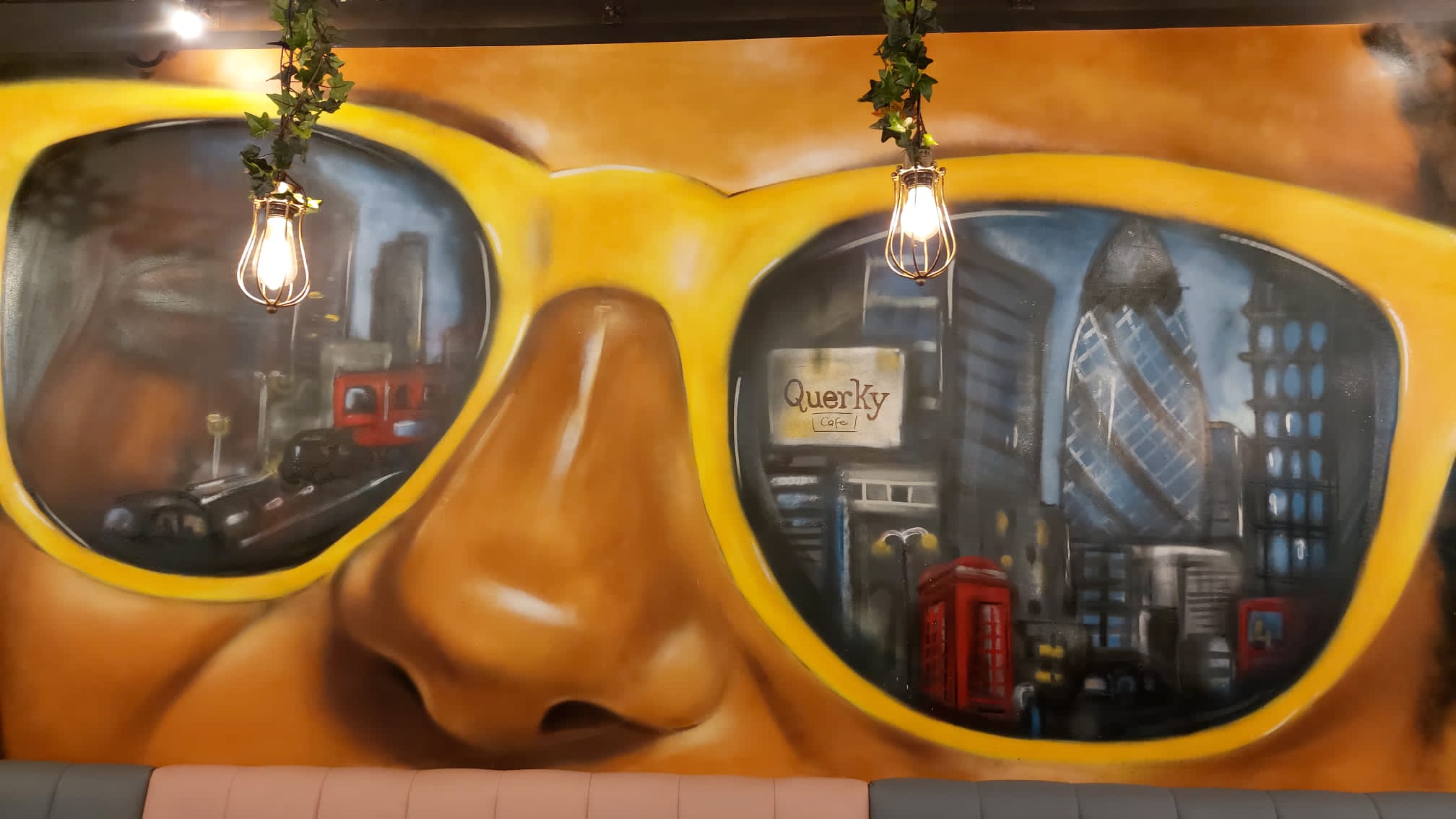 La nostra missione è soddisfare i nostri clienti creando, con loro, una sintonia. Qwerky è uno dei nostri partner più vecchi e Faisal, il proprietario, ripone in noi tanta fiducia da mantenere una relazione lavorativa costante con progetti sempre freschi e nuovi. Era proprio in cerca di qualche nuova ispirazione a Forrest Gate e noi abbiamo creato l'ambiente cominciando con un'incredibile giraffa che beve un caffé all'aperto e poi, step by step, riempiendo l'area con ulteriori artwork ( una mano che afferra da dietro un cancello nero, un polpo tuttofare, una porta astratta). La piovra ricorda un uomo indaffarato a riparare diverse situazioni con altrettanti diversi oggetti. La giraffa, invece, rappresenta il nostro sogno perduto nel cielo e il caffé che sta bevendo è un richiamo al business che insegue. La mano è stata un'opportunità unica e libera di usare lo spazio nel cortile al fine di attirare persone e rendere l'area un po' più apprezzabile per i residenti. Nel frattempo, Faisal ha aperto un altro Qwerky, questa volta a Shedwell, chiedendoci di installare una luce al neon che insieme a diversi effetti spray avrebbe dovuto abbellire il loro logo e ci ha invece lasciato carta bianca a Walthamston dove, per il suo primo negozio, abbiamo creato artwork unici che sembrano staccarsi dalla parete e prendere vita e, con il ragazza afro, abbiamo rappresentato la città in cui viviamo, Londra, riflessa nei suoi occhiali gialli.